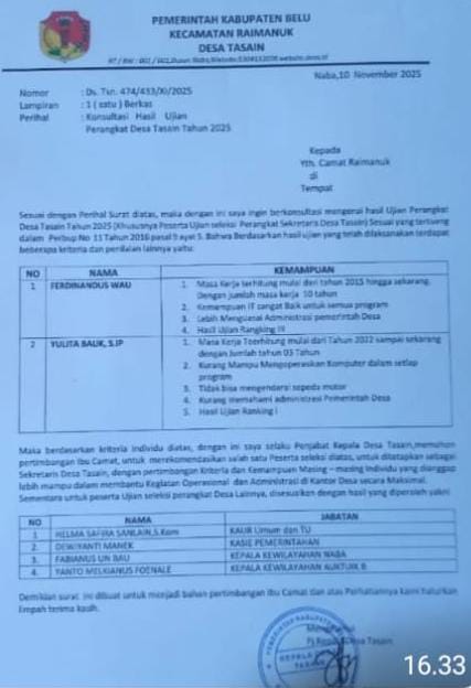 “hasil konsultasi itu benar saya yang buat untuk di ajukan ke ibu camat untuk dipertimbangkan dengan beberapa hal terkait masa kerja dan kemampuan IT yang dimiliki oleh kedua calon yang saya ajukan ke ke tim seleksi kecamatan, tetapi soal beredarnya surat tersebut saya tidak tau”, ujar PJ Desa Tasain ketika dihubungi lewat WA pada 27 November 2025 pkl 18:05.